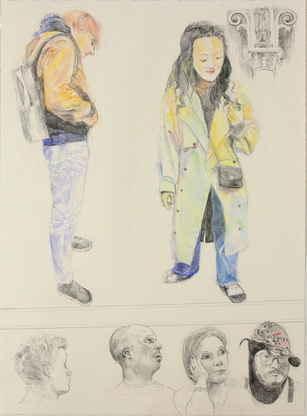 These drawings represent the broad interests of my work, and also demonstrate some experimentation. I use charcoal and pastel to also plan for larger work. These images include a series of drawings where the placement. of the figures defines the space that could be on the street, in a museum, or on a subway platform, all in charcoal on paper. There is also a series of individuals with charcoal and prismacolor pencils.